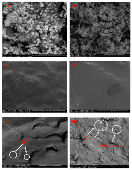 Figure 3a,b demonstrates the morphologies of BFO and PoPD powder from SEM analysis, which clearly indicates that they are composed of a high amount of homogeneous distribution of rhombohedral and spherical particles. The SEM micrographs in Figure 3c,d revealed that the surface of the CMC film and CMC/CNCMCC film (control films) were smooth, continuous, and homogeneous, with no cracks or irregularities; this indicates that the CNCMCC was evenly distributed within the CMC matrix without agglomeration. This might be attributed to compatibility between the CNCMCC and CMC matrix because of their similar chemical structures [20,24]. Besides, the small dimensions of CNCMCC might have played an effective role in the homogeneous distributions of CNCMCC in the CMC matrix. The addition of BFO resulted in back-scattered electrons of metal particles on the film surface, indicating the presence of Bi and Fe distributed within the CMC matrix. Furthermore, it was observed that BFO and PoPD had an effect on the microstructure of the nanocomposites, and therefore the surface of the CMC/BFO/PoPD and CMC/CNCMCC/BFO/PoPD composite films had a more heterogeneous and rough structure than the control films, as shown in Figure 3e,f. This can be attributed to the agglomeration of the filler with PoPD and BFO in the composite films. The presence of PoPD in the system can be observed and confirmed using SEM-EDX (Figure S2).