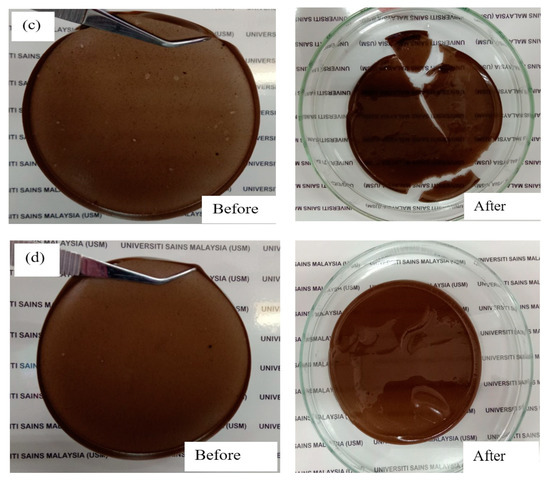 A water absorption test was conducted by cutting the films into 0.02 m 0.02 m and dried at 40 °C for 24 h until the film sample reached a constant weight. The dried film samples were then immersed in a covered beaker filled with 50 mL of distilled water at 25 °C for 24 h with periodical gentle manual agitation. The water absorption was calculated by using the formula in Equation (1).