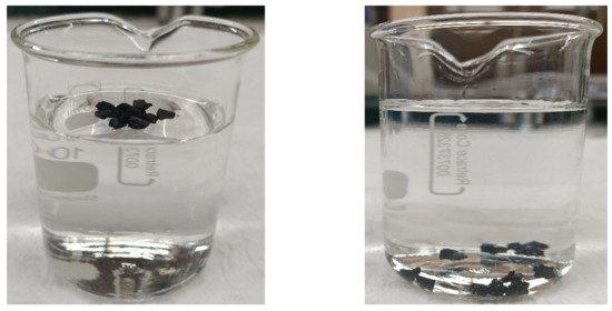 The crumb rubber particles have a rough and vesicular surface that can trap water molecules in their vesicular cavities. In addition, they contain a large amount of carbon black, which has a good adsorption capacity [51]. In order to better analyse the results in this study, a water absorption/adsorption test for rubber particles was carried out. The particles were soaked in water for two separate durations, namely 2 h and 24 h each. The rubber particles were pushed into the water and left soaking for the different durations of soaking. Since the density of air is 1.225 kg/m3, which is significantly lower than that of water, i.e., 1000 kg/m3, once the particles are submerged in water, they initially displace the adsorbed low-density air molecules and take their place. Over time, the air trapped in the vesicular cavities is slowly displaced by the water molecules, increasing the amount of absorbed/adsorbed water in the rubber particles. This is evident from the different percentages of absorbed/adsorbed water between the 2 and 24 h soaking durations, as shown in Table 4. Figure 2 shows the freshly dropped rubber particles floating on water (left) and the same rubber particles submerged in water after they displace the low-density air molecules with high-density water molecules (right), increasing the density of the rubber particles, thereby making them submerge in the soaking water. The crumb rubber particles were then taken out of the soaking container after the designed soaking periods and the excessive water was strained off with the help of a 300 µm fine mesh strainer. The strained rubber was then weighed and dried for 24 h in an oven with temperature of 40 °C. After drying, the rubber was weighed again to check the absorption of water by the crumb rubber particles, which is expressed as the ratio between rubber weight increase due to water absorption/adsorption and the dry rubber weight. Table 4 presents the water absorption/adsorption by the rubber particles after different soaking periods. As can be observed in the table, the water absorbed/adsorbed by rubber after 24 h was only 24% higher than that after 2 h. This indicated that the rate of rubber water absorption/adsorption did not linearly increase with the soaking time, and the longer soaking time did not add much to the rubber water pre-treatment benefits.