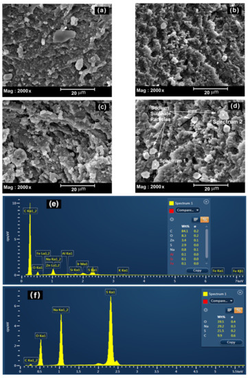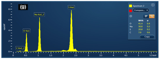 SEM images were taken on carbon coated raw crumb rubber and the crumb rubber soaked in 5% sodium sulphate solution for 2 h using FEI Quanta 200 SEM at 2000× magnification to understand the surface morphology and the effect of soaking crumb rubber particles in sodium sulphate solution. Figure 3 presents the SEM images of Figure 3a–c raw rubber and (d) rubber soaked in 5% sodium sulphate solution for 2 h. The SEM image of rubber particles soaked in the sodium sulphate solution shows a deposition of a large number of sodium sulphate particles. This further reinforces the XRD observation that the sodium sulphate solution does not react with any chemical component of the raw rubber and just gets deposited on the surface of the rubber particles. EDS analysis was undertaken on the untreated and treated rubber particles soaked in 5% sodium sulphate solution for 2 h and then dried at 40 °C temperature. Figure 3e show the EDS analysis of untreated crumb rubber, and Figure 3f,g shows the EDS analysis of the sodium sulphate particles deposited on the rubber surface. The EDS analysis of white particles deposited on the surface of the rubber particles soaked in sodium sulphate solution clearly show Na, S, and O elements, indicating the deposition of sodium sulphate particles. However, there was the presence of the element Carbon in the EDS analysis, which was most likely because of the electron beam spilling on the rubber surface, generating X-rays from the carbon present in the crumb rubber.