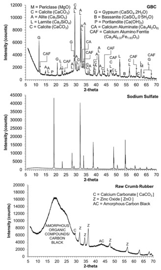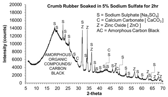 The XRD of crumb rubber, soaked in 5% sodium sulphate solution for 2 h, was conducted to identify whether the sodium sulphate solution reacted with the rubber particles and changed its properties or was simply absorbed/adsorbed by the rubber particles. Figure 4 shows the XRD diffractograms of GBC, sodium sulphate, raw crumb rubber, and crumb rubber soaked in 5% sodium sulphate solution for 2 h, along with their corresponding known crystalline and amorphous phases. The XRD diffractograms do not show any chemical change in the rubber particles with 2 h soaking in 5% sodium sulphate solution, indicating that the sulphate solution is only absorbed/adsorbed by the rubber particles and does not react with the rubber particles.