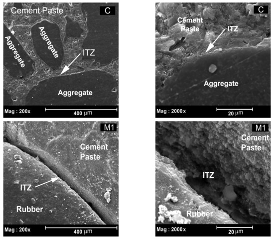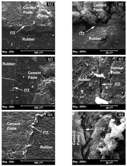 On soaking the rubber particles in plain water for 2 h in M2, the absorbed/adsorbed air on the rubber particles was displaced by water molecules. The SEM images of M2 (Figure 8) show a dark and dense rim of cement paste around the rubber particles, with a seamless interfacial transition zone. This indicates that the air absorbed/adsorbed into the rubber particles repels or acts as a barrier between the cement paste and the rubber particles, which when it gets displaced by water on soaking, helps in the formation of a dense and seamless ITZ. This is a significant improvement for achieving a good cement paste to crumb rubber bond performance, which otherwise required a very long period of water soaking [55] or complex chemical treatments [32,33,56]. Moreover, the darker tone of the rim around the rubber particles also indicates the increased degree of hydration compared to the cement paste outside of the rim. This is most likely because of the additional water absorbed/adsorbed by the rubber particles, which is available for the hydration of the cement particles that are in close proximity to the rubber particles. Moreover, the mixing procedure of crumb rubber mixes also holds the key to obtaining a dense paste formation at the ITZ between the cement paste and the rubber aggregates. The soaked rubber particles were mixed with the cement powder after straining off the excess water as a first step, which formed a good coating of the cement particles around the rubber aggregates. The increased amount of cement around the rubber particles, in addition to the increased amount of absorbed/adsorbed water available from the crumb rubber particles, was most likely responsible for the formation of a dense rim of hydrated cement paste around the rubber particles of mix M2 compared to M1. This improvement in the bond behaviour and the formation of a dense ITZ around the rubber particles in M2 was also reflected in the 14.8% improvement in its 28-day compressive strength, in comparison to that of mix M1. Compared to the control mix, M2 showed 31.9 and 12.4% reductions in its 7- and 28-day compressive strength results, respectively. Interestingly, the 7-day strength results of M1 and M2 did not show any considerable differences. This could possibly be because the available water molecules absorbed/adsorbed to the rubber particles may not have been depleted at 7 days of curing. However, at later stages, as the internal relative humidity of the cement paste decreases due to the increased degree of hydration, the capillary stresses within the cement paste increased due to the reduction in pore water [57]. This results in the drawing up of this available water by the capillary pores, which not only reduces shrinkage, but is also consumed by the un-hydrated or partially hydrated cement particles [57]. This results in the increase in strength that was evident in the improvement of the 28-day compressive strength of M2, in comparison to that of M1.