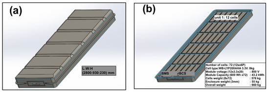 Very large batteries, usually mounted in the vehicle’s underbody, typically consists of several small cells in a sealed enclosure made of aluminium alloy, CFRP, basalt epoxy composite, or steel. Every battery housing has a cover, so the entire battery need not be discarded if small defects appear. Accessibility to the battery unit is important for repairs and at the same time road sprays are not permitted to intrude through the gap between the cover and the housing. In addition, thermal management system and venting system become more complicated and expensive; hence, the demand has been raised for more simple enclosure that can act passively during thermal runaway or external damage to the cells [3]. Figure 1a,b shows our CAD concept for LIB battery power pack for electric car, highlighting the battery management system (BMS), battery cooling system (BCS), and the output power.