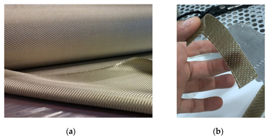 Filava-Polysiloxane Composite (FPC) was manufactured using the vacuum bagging process. Filava dry fabric 3K, 2 × 2 twill pattern (Figure 2b) with areal density 200GSM was used as reinforcement fibres. A commercially available methylphenylvinylhydrogen polysiloxane, Silres® H62C produced by Wacker Chemie AG (Burghausen, Germany) was used as a resin [14]. The shrinkage of the resin was modified using 1 wt.% silica nano particles filler.