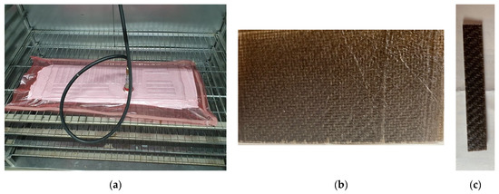 (a) Preparation of vacuum bagging; (b) Surface texture of the specimen; (c) Specimens after curing.