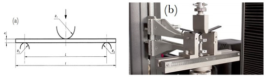 Flexural test set up (a) sketch of 3-point bend, where R1, R2, and h: 10, 5, and 2.15 mm, respectively, (b) Zwick Roell universal testing machine.