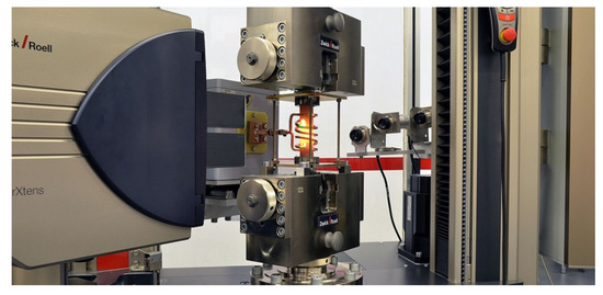 The aim of the test was to examine the strength of FPC in the event of LIB sudden fire bust inside their enclosures. Although there is a safety venting valve built-in in any enclosure, it is common that these valves become faulty with passing time due to spring failure, or they were blocked by internal debris from the cooling management system inside the enclosure [17]. In the event of extreme LIB thermal runaway, some of the inevitable incidents such as short circuit, punch damage, or voltage overcharge and discharge, a simultaneous raise of pressure and temperature inside cells could occur. This is a very common phenomena in Lithium Ferro Phosphate (LFP) batteries, which are used mainly in electric cars due to their stable voltage supply during operation [9]. Hence, the thermal strain test was tailored to demonstrate this scenario by using a high temperature tensile testing rig (Zwick Roell in Germany) shown in Figure 6. This arrangement ascertains both tensile force and temperatures to be applied simultaneously according to standard ISO 6892-2 till failure. Specimen with dimension (L × W × h) (100, 15, 2 mm) is gripped between two ceramics jaws and exposed simultaneously to an increasing temperature from 20 to 1000 °C ramped at rate 10 °C/min and a tensile force rate 100 N/min in argon environment. The test was conducted on five samples and each test lasts 120 min. A ceramic built in extensometer was attached to the specimen to detect one-directional displacement. TestXpert/research software was used to record the data and exported in a digital format [18]. Thermal strain plots exported into excel format to understand the correlations between force-displacement-temperature.
