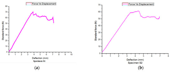 Flexural testing plots of test specimens: (a) Sample 1, (b) Sample 2.