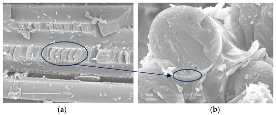 SEM images shows the effect of fibre sizing (a) surface ridges and (b) fibre matrix interface.