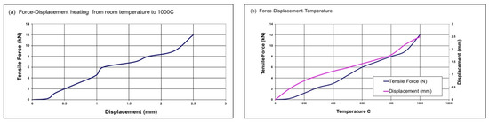 From the thermal tensile test and force/deformation, a plot was obtained during the specimen thermal cycle from room temperature to 1000 °C, as shown in Figure 9a. There is a clear non-linear correlation between tension force and deformation till failure at 2.5% strain at 1000 °C. The deformation and tensile force curve at elevated temperature is shown in Figure 9b. The ultimate tensile strength was calculated as (12,000 N/30 mm2 = 400 MPa) and tension modulus was calculated as (400 MPa/0.025 = 16 GPa).