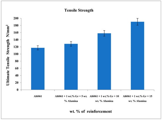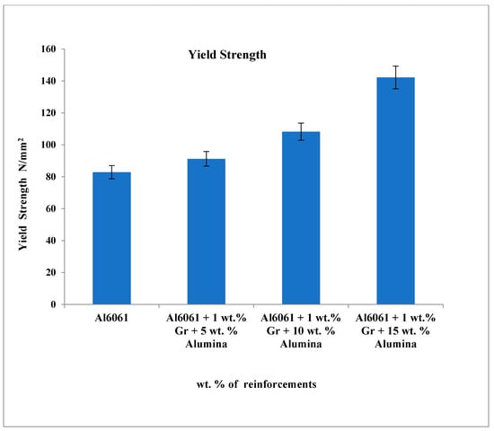 - Al6061 composites displayed higher hardness than unadulterated Al6061alloy. The hardness expanded by about 69.10% with the reinforcement of 1 wt. % graphene and 15 wt. % Al2O3p.