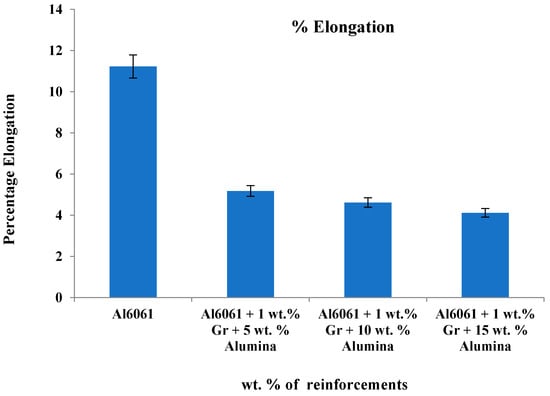 - % of elongation lessens with enhancement in weight % of reinforcement, however due to the hard particulate’s existence, brittleness occurs that diminishes the ductility of the composites. This may likewise be credited to the harder ceramic Al2O3p and graphene particles.
