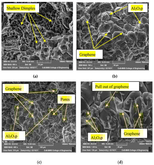 - The fracture was pliable with dimple surface showing particle debonding and particle breaking. With fractography, the failure of the composites appeared to comprise transgranular break of the graphene–Al2O3p reinforcement and ductile fracture of the AA6061 base matrix.