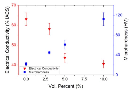 Since TiB2 acts as a second phase in the Al matrix and has mobile free electrons with different energy levels in different electronic structures, a decaying trend in the electrical conductivity is expected. However, even for an Al system with up to 10 vol.% TiB2, as in our case, about 43% IACS electrical conductivity is still very high, and it is thus suitable for many electrical applications.