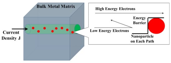 Figure 3 presents a schematic of the electrons pathway inside a metal matrix nanocomposite. The topographical impedance on the current density pathway will block the transport of electrons, as shown in Figure 3. At the macroscopic level, (~0.23505 uOhm–cm in our case) will be greater than (~0.00797 uOhm–cm in our case) (especially when ). This is because the nanoparticles’ interaction with the matrix is negligible (both physically, such as the Gibbs free energy change, the interfacial energy change, and the phase transition energy, and chemically, such as the chemical reactions and the electronic structure’s tuning) [40]. As a result, the nanoparticle phase will play a dominant role in the electrical conductivity of the nanocomposite. Furthermore, the valences of the electrons are different in the metal Al and the ceramic TiB2, which leads to deviation from the approximate linearity of the electrical resistivity associated with for the electrical conductivity and nanoparticles volume fraction, as shown in Figure 3.