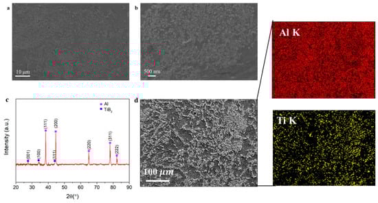 Electron microscopy study. (a) SEM images of the Al–TiB2 nanocomposite samples. (b) Higher-magnification SEM images obtained from the Al–TiB2 nanocomposites. (c) XRD scanning results to confirm the phases in Al–TiB2 (Al–3 vol.% TiB2 as an example). (d) EDS mapping for the Al–TiB2 nanocomposites (Al–5 vol.% TiB2 as an example) after ion milling to expose the TiB2 zone.