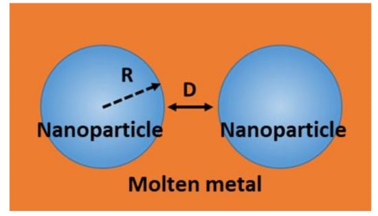 The van der Waals potential between two nanoparticles in a molten metal is of a relatively long range (0.2−9 nm). Nanoparticles tend to attract each other due the attract force induced by van der Waals potential. The van der Waals potential for two identical spheres of radius R1 is determined by [44,45]: