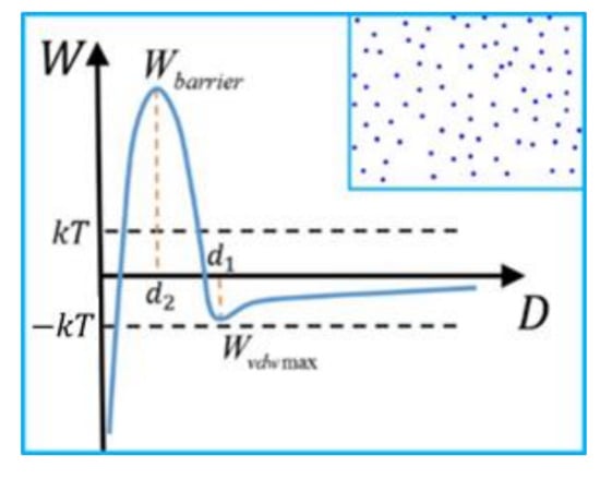 Figure 7 shows the interaction potentials for nanoparticle self-dispersion in the molten metal. If Wbarrier is high (i.e., good wettability between the nanoparticle and the molten metal) and the van der Waals potential well is not deep, the Brownian potential, kT, cannot cause the nanoparticles to pass the barrier for any adhesive contact, although the nanoparticles would not be kinetically trapped either. This would allow the nanoparticles to move freely without forming a chemical bond to another nanoparticle in the molten metal, which is the so-called self-dispersion.