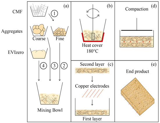 All the aggregates are initially heated under 180 C for 3 h, and EVIzero, molds, metal mixing bowl and other necessary metal equipment are put in the oven for one hour under the same temperature. The hot mixture is produced by mixing CMF with the fine aggregates inside the metal mixing bowl, after which the coarse aggregates are added and mixed followed by the melted EVIzero (Figure 1a). Subsequently, materials are mixed using an electric mixer inside the metal bowl seated inside the electric heater cover set at 180 C to keep the materials under mixing temperature. The mixing continued until homogeneity is achieved (Figure 1b). Half of the mixture is cast into a rectangular mold of base dimensions 40 cm × 30 cm to form the bottom layer. Five 1 mm diameter copper electrodes of 40 cm length are placed into the cast mix at a mutual distance of 6 cm. Then, the rest of the mixture is casted (Figure 1c). The sample is compacted using an Advantest Controls Model 77-PV41A02 Slab Compactor under 160 C until a 3.5 cm thickness is reached, which corresponds to a 2.6 g/cm density (Figure 1d). After cooling down, the sample is cut in half along its long side, and the electrode tips are made accessible for wire connections by removing the material around them. At the end, two samples are produced, each measuring 30 cm × 20 cm × 3.5 cm (Figure 1e).