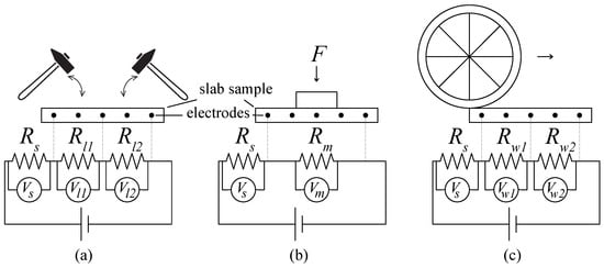 The use of 5 lines of electrodes enables the configuration of the electrical setup to conduct load localization (the LL case), load magnitude sensing (the LM case), and waveform sensing (the WF case) [46]. Figure 3 schematizes the equivalent circuit configurations under these three cases, where the samples are electrically represented as resistors connected in series.
