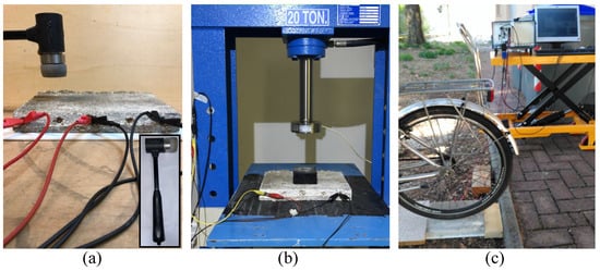 Loading methods: (a) the LL case—impact hammer; (b) the LM case—hydraulic press; and (c) the WF case—rolling bicycle.
