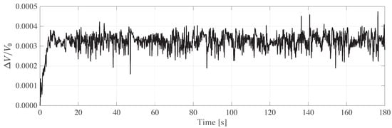 The first step in the experimental investigation is to study the electrical stability of the composite to determine if the materials suffer from the polarization effect commonly found in other types of materials such as cement-based ones. Polarization manifests itself as a temporal increase in the resistance in unloading conditions. While it is possible to reduce or even eliminate polarization for cement-based materials using dedicated measurement methods such as the biphasic input voltage measurement method presented in [37], polarization is only a concern in the measurement of static loads, because it can be assumed that the electrical steady state is already reached prior taking dynamic measurements. Nevertheless, the phenomenon needs to be assessed a priori, because it may occur over very long periods of time, necessitating long times of charging prior to take measurements. Figure 5 plots the time history of the relative change in voltage read on the unloaded composite sample over a period of 3 min. From the signal, it can be observed that the polarization period is approximately 5 s during the initial charging of the sample. Once the polarization is completed, the sample provides a stable signal under DC voltage, remaining within the range of , equivalent to a negligible variation.