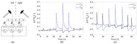 To further evaluate the sensing capabilities of the composite pavement unit more, the acquired signals and are plotted in Figure 9 for the loaded cases. It is observed that there is a time shift between the occurrences of peaks indicated by . This time shift is related to the speed of the bicycle.