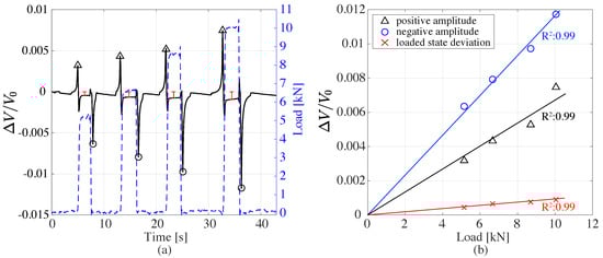 The results of the rapid loading–unloading tests done on the pavement sample (the LM case): (a) the generated voltage pulses along with loading–unloading pattern, where the red lines represent the deviation from 0 during the loaded period of the sample; (b) readings of positive and negative amplitude peaks and deviation from unloaded state along with the linear fits and R values.
