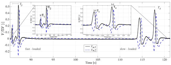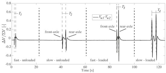 Time series of voltage pulses obtained from the pavement sample during the bicycle pass tests, showing the ratio to the total read voltage () and the time period between front and rear axle occurrences T.
