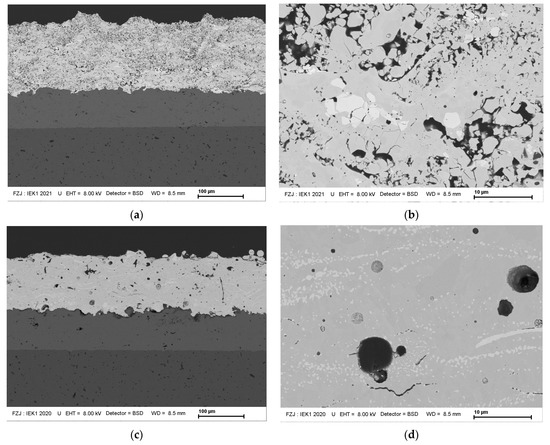 In Figure 1 and Figure 2 the micrographs of the different coatings in the as-sprayed condition as well as after heat treatment (100 h, 1300 °C) are shown. The coating thickness of all the different coatings was between 100 and 150 μm. In all images, no signs of inter passage porosity bands are found. These are often formed due to the cooling of the surface between individual passages. Here the used single passage deposition has a clear advantage.