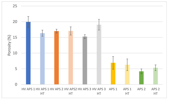 Figure 3. Porosity levels of the different coatings (see Table 1) in the as-sprayed state and after heat treatment (HT, 1300 °C, 100 h).