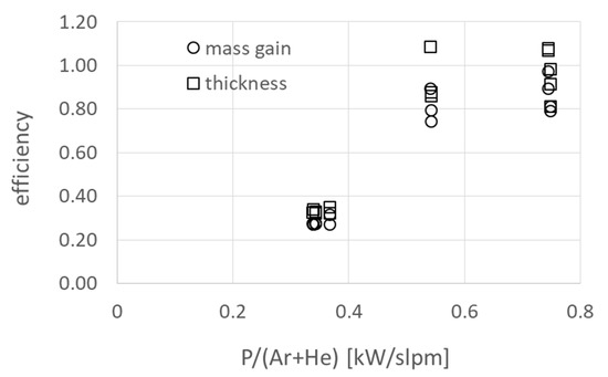 Figure 4. Efficiency of the different spray trials as a function of the power normalised to the total gas flow (circles: efficiency from mass gain, squares: from coating thickness) for different substrates.