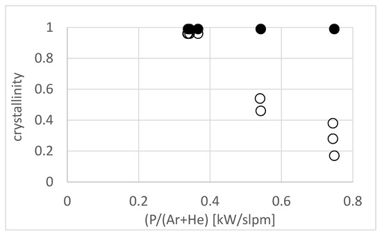 Figure 5. Degree of crystallinity of the as-sprayed (open symbols) and heat-treated (100 h, 1300 °C, closed symbols) coatings as a function of the power normalised to the total gas flow for different substrates.