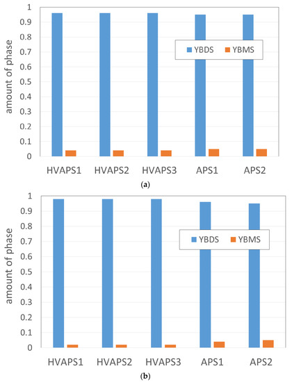 Figure 6. Amount of crystalline Yb2Si2O7 (YbDS) and Yb2SiO5 (YbMS) phases in the as-sprayed coatings (a) and after heat-treatment at 1300 °C for 100 h (b).