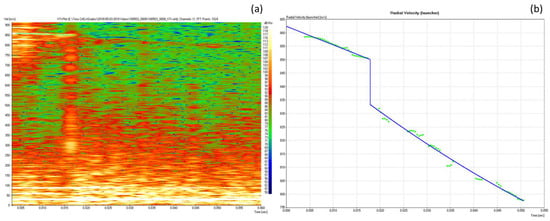 Figure 2a presents typical raw data of Doppler radar. In Figure 2b, the curve adjustment by means of Windopp software is shown. In this radial velocity fitted curve, one may verify that the projectile is fired with an initial velocity of 863 m/s, and it reaches the target, i.e., epoxy/piassava composite, at a velocity of 850 m/s. The projectile’s impact with the target is associated with vertical line at about 0.018 s. The projectile exits the target with a residual velocity of 832 m/s. The shape of the single curve, with continuously decreasing velocity, indicates that the bullet was kept intact after the ballistic impact.