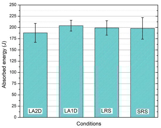 The highest energy absorption was calculated as 222 J for the SRS condition, while the lowest value of 167 J was obtained for the LA2D condition. Considering these results, the average values associated with the standard deviations suggests that the absorbed energy of all conditions was virtually the same. Further statistical analysis is required to validate this data. Table 2 presents the ANOVA parameters.