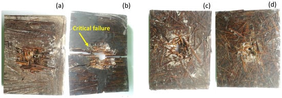 As none of the differences were found to be higher than the calculated honest difference, it is further confirmed that the target material arrangement does not influence the energy absorption of the ballistic impact. On the other hand, when the physical or structural integrity of the composites plates is taken into consideration, there is a clear difference, as shown in Figure 4a–d.