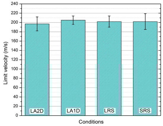 For the LA1D condition, Figure 4b, a critical crack propagates from the impact point towards the edge of the composite following the same axial direction of the fiber arrangement. No other condition, Figure 4a,c,d, displayed a similar failure. For these conditions, the fiber reinforcement arrangement was able to block the path of the crack, preventing a catastrophic failure of the system. This analysis suggests that fiber reinforcement arrangement in an aligned and axial configuration may not be suitable for ballistic applications. None of the conditions were able to stop the projectile impact, they only absorbed part of its kinetic energy, as discussed in Figure 2b. To investigate a scenario where the projectile would be stopped by the target, the limit velocity was calculated for each condition []. Figure 5 presents these results.