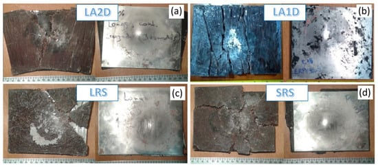 Macroscopic aspect of failure after ballistic impact (a) LA2D; (b) LA1D; (c) LRS, and (d) SRS.