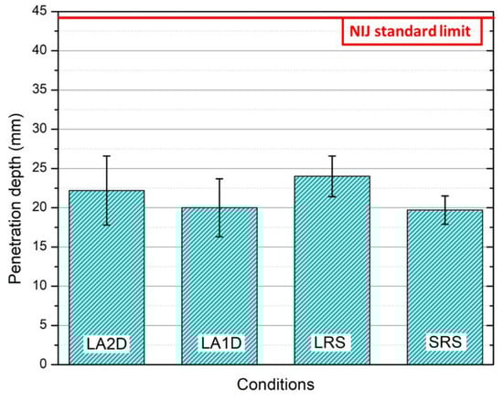 Figure 7 presents the indentation depth of the investigated MAS. Perforation and Back-face signature test, in accordance with the NIJ standard [], states that for a material to be considered effective against high energy ammunition, it must not be perforated nor display a back-face indentation depth greater than 44 mm.