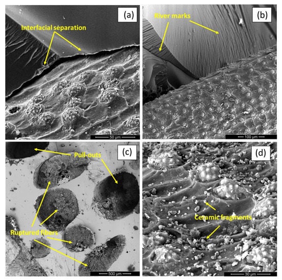 In Figure 8a, the interfacial separation between fiber and matrix is shown. In this figure, an arrow highlights the crack that propagates through the interfacial separation between the epoxy matrix (above) and piassava fiber (below). In Figure 8b, the fragile characteristic of the matrix is evident by the presence of “river marks”, which are associated with the brittleness of the epoxy. In Figure 8c, one may notice both the pullout and rupture of fibers. All these mechanisms were observed and disclosed as responsible for absorbing part of the energy of the ballistic impact in both ballistic configuration (MAS and individual performance). Finally, in Figure 8d the mechanical encrustation of ceramic fragments in the piassava fiber surface is visible. This phenomenon, observed only for the MAS test configuration, is associated with electrostatic and Van der Waals attraction forces []. This characteristic is essential for an intermediate layer in MAS, as the cloud of ceramic fragments generated after the ballistic impact could be considered as harmful as the projectile itself.