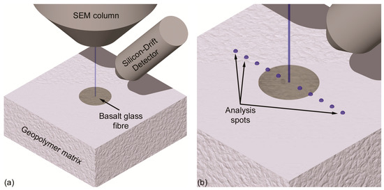 Hence, the use of analytical techniques at the micro and nano-scale, such as scanning electron microscopy (SEM) and energy dispersive X-ray microanalysis (EDS), transmission electron microscopy (TEM) and electron energy loss spectroscopy (EELS), nuclear magnetic resonance (NMR), micro-computed tomography (µCT) and scanning probe microscopy (SPM), is required to obtain information of these composite materials, which are fundamental to better understand their mechanical performances at the macroscopic scale [13,16,17,18,19,20]. From this perspective, SEM coupled with EDS is a suitable instrumental approach to characterize the micro/nanomorphology, the texture and architecture and the local chemistry of both freshly synthesized geopolymeric composites and mechanically stressed specimens [21,22]. Indeed, the correlation between morphology and local chemistry is of utmost importance to devise fibre-reinforced geopolymeric composites with desired mechanical properties because these are controlled by several factors. For instance, it is expected a deep influence on the quality of the final product from the formulation of the geopolymeric matrix, which in turn affects the rate of the reaction and the homogeneity of the geopolymer, the resistance to corrosion of the geopolymer particles/fibres, the distribution of the fibres, and the interface between the fibres and the matrix.