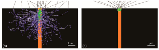 Bidimensional projections of the three-dimensional electron trajectories simulated inside a basalt-derived glass fibre (orange area, radius of 300 nm, “infinite” height) embedded in a K-PSS geopolymer matrix (black area) for an electron beam energy of (a) 20 keV and (b) 6 keV. When the electrons are moving inside the fibre or the matrix, or when they are escaping the sample surface, the trajectories are coloured in green, blue and grey, respectively.
