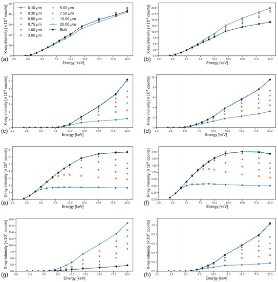 The results of the described Monte Carlo approach are reported for the main elements composing the basalt-derived glass fibre and the geopolymer matrix in Figure 3. In detail, Figure 3a–h show how the integrated X-ray intensity varies for the X-ray Kα lines of Si, Al, Fe, Ca, Mg, Na, K, Ti depending on the selected electron beam energy. The figures report the simulated intensities for both a glass fibre with variable radius in the range 100 nm–20 µm (continuous lines for the extreme values) and the reference bulk material (black dashed line). A non-linear reduction of the X-ray intensities of Si Kα, Fe Kα, Ca Kα, Mg Kα, Na Kα, Ti Kα as a function of the radius of the circular section of the fibre can be observed, down to the minimum value of 100 nm.