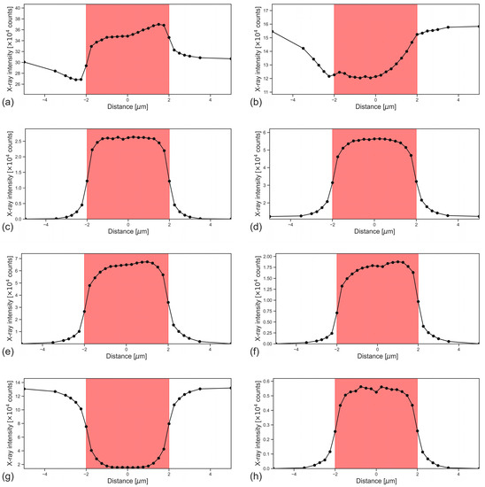 Integrated X-ray intensity calculated from simulated EDS spectra of the composite sample as a function of the distance of the analytical point from the centre of the circular section of the glass fibre (see Figure 1b). The red area in the various plots represents the fibre vertical section, with a radius of 2.0 μm. The reported trends are those calculated for the Kα X-ray emission line of (a) Si, (b) Al, (c) Fe, (d) Ca, (e) Mg, (f) Na, (g) K and (h) Ti.