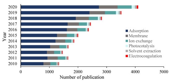 Publications on the removal of heavy metals via different techniques from 2010 to 2020, based on the Scopus database.