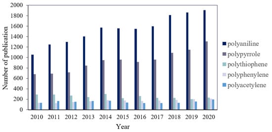 Evolution of the number of published papers between 2010 and 2020 with the keywords: “polyaniline”, “polypyrrole”, “polythiophene” “polyphenylene”, and “polyacetylene”, based on the Scopus database.