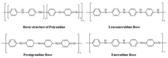 Polyaniline, commonly abbreviated as PANI or Pani—also known as aniline black—was discovered for the first time by Ferdinand Runge in 1834 from the initial oxidation of aniline. Later, in 1862, Henry Letherby achieved its first electrochemical polymerization. Since then, it has been applied in a variety of colored materials and dyes. Recently, PANI has gained much attention of the scientific community due to the rediscovery of its conductive properties in the 1980s. Its structure consists of a succession of aromatic rings of the benzene diamine and/or quinone di-imine types, bridged by a nitrogen heteroatom. PANI has three oxidation states that are represented in Figure 3: fully reduced leucoemeraldine base (LB), fully oxidized pernigraniline base (PB), and half-oxidized emeraldine base (EB)—which is converted to emeraldine salt via protonation with organic and inorganic acids [22].