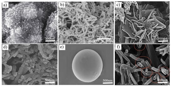 SEM images of different structures of PANI polymer: (a) 3D hierarchical PANI [28], (b) nanowire [29], (c) nanoflowers [30], (d) nanorods [31], (e) microspheres [32], (f) nanotubes [33].