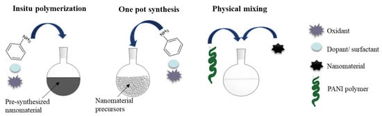 Synthetic strategies for the preparation of nanocomposites are of great importance, as they influence the resulting product in terms of its morphology and properties. In the available literature reviewed for this study, PANI/nanomaterial composites have generally been synthesized based on three paths, as represented in Figure 5: